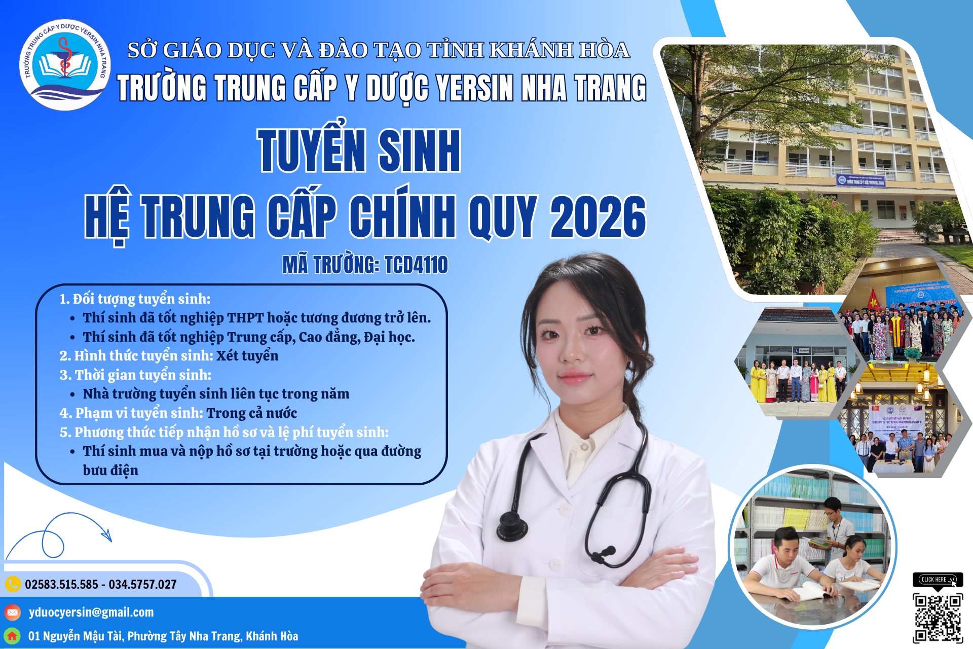 -------------------🌸🌸-------------------------- TRƯỜNG TRUNG CẤP Y DƯỢC YERSIN NHA TRANG XIN TRÂN TRỌNG THÔNG BÁO LỊCH NGHỈ LỄ GIỖ TỔ HÙNG VƯƠNG NHƯ SAU: Lịch nghỉ: Từ thứ 7, ngày 25/04/2026 đến hết thứ 2, ngày 27/04/2026. Thời gian làm việc trở lại: Thứ 3, ngày 28/03/2026. Trong thời gian nghỉ lễ, mọi công việc cần liên hệ gấp, vui lòng liên hệ số hotline: 02583.515.5